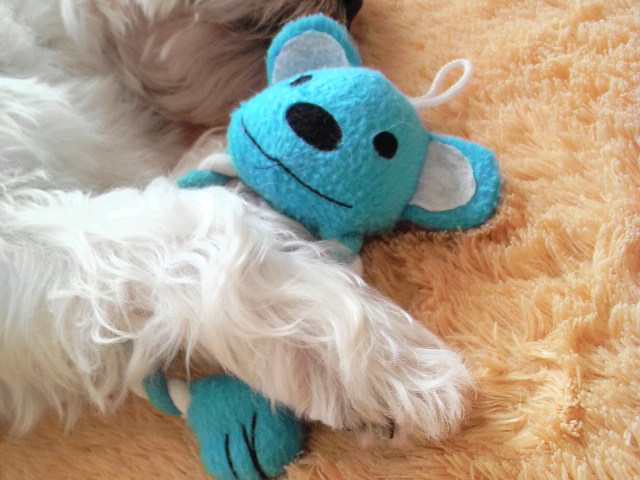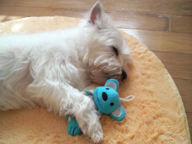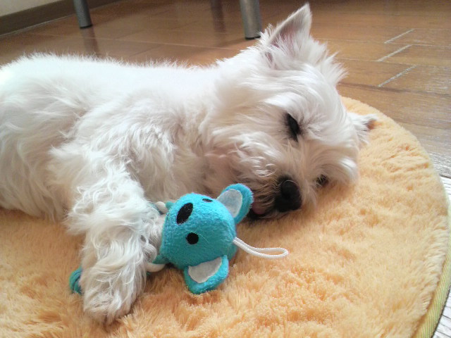 を弄る私の側でおもちゃを手放さずに寝ている蓮