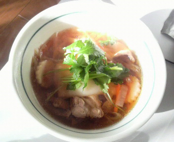 鶏肉・かまぼこ・大根・人参・ネギゴボウ・三つ葉が入ってめんつゆベース