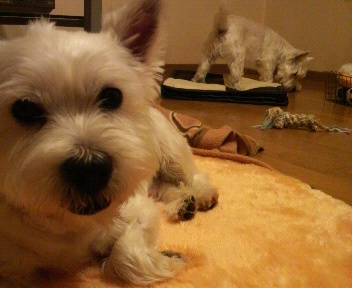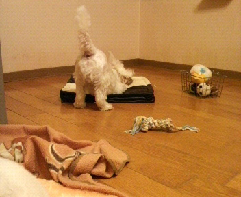 一生懸命におもちゃをクッションに擦り付けている・・・